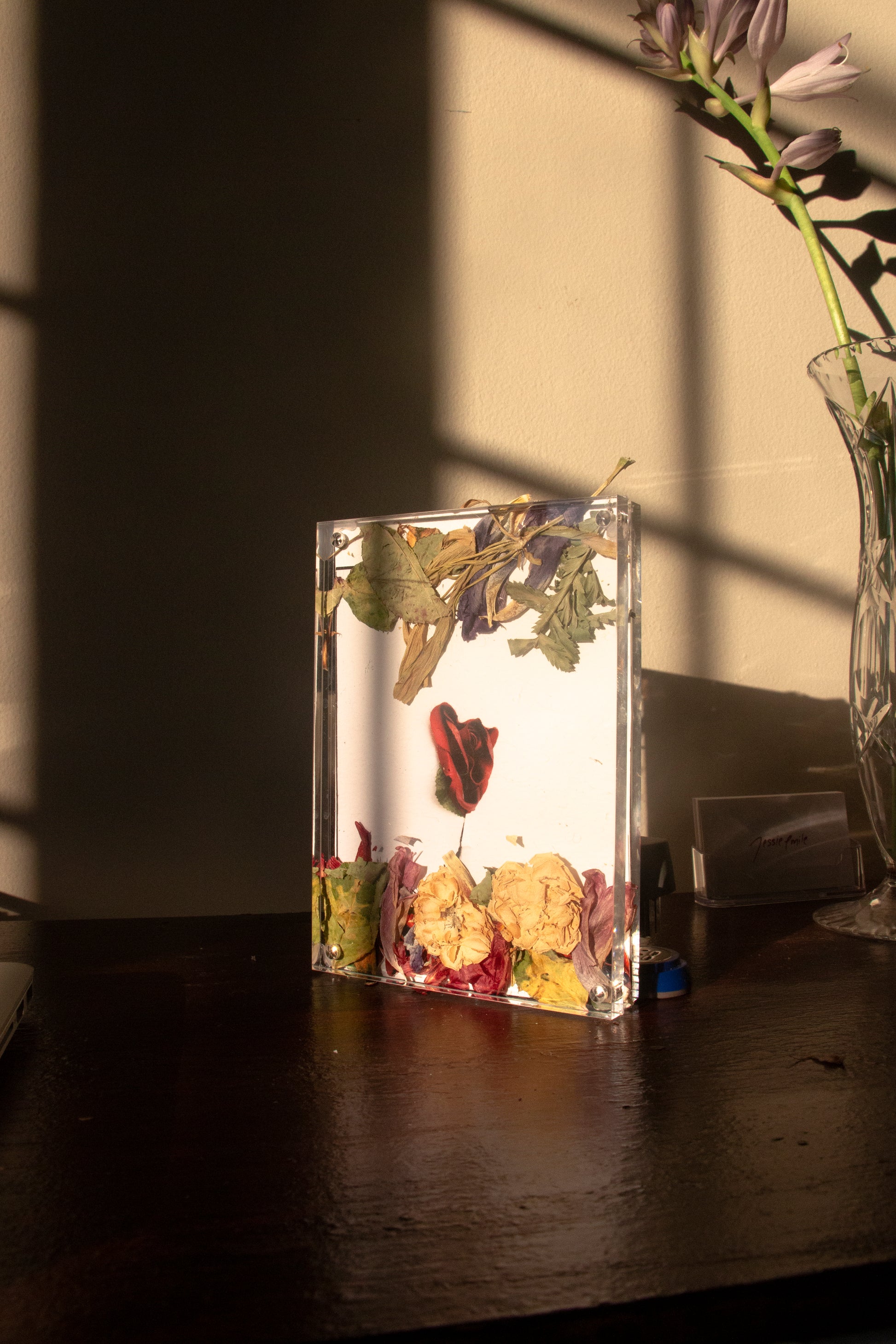 Every frames are uniquely made, an arrangement of real flowers onto a cotton paper, sealed into an acrylic frame.