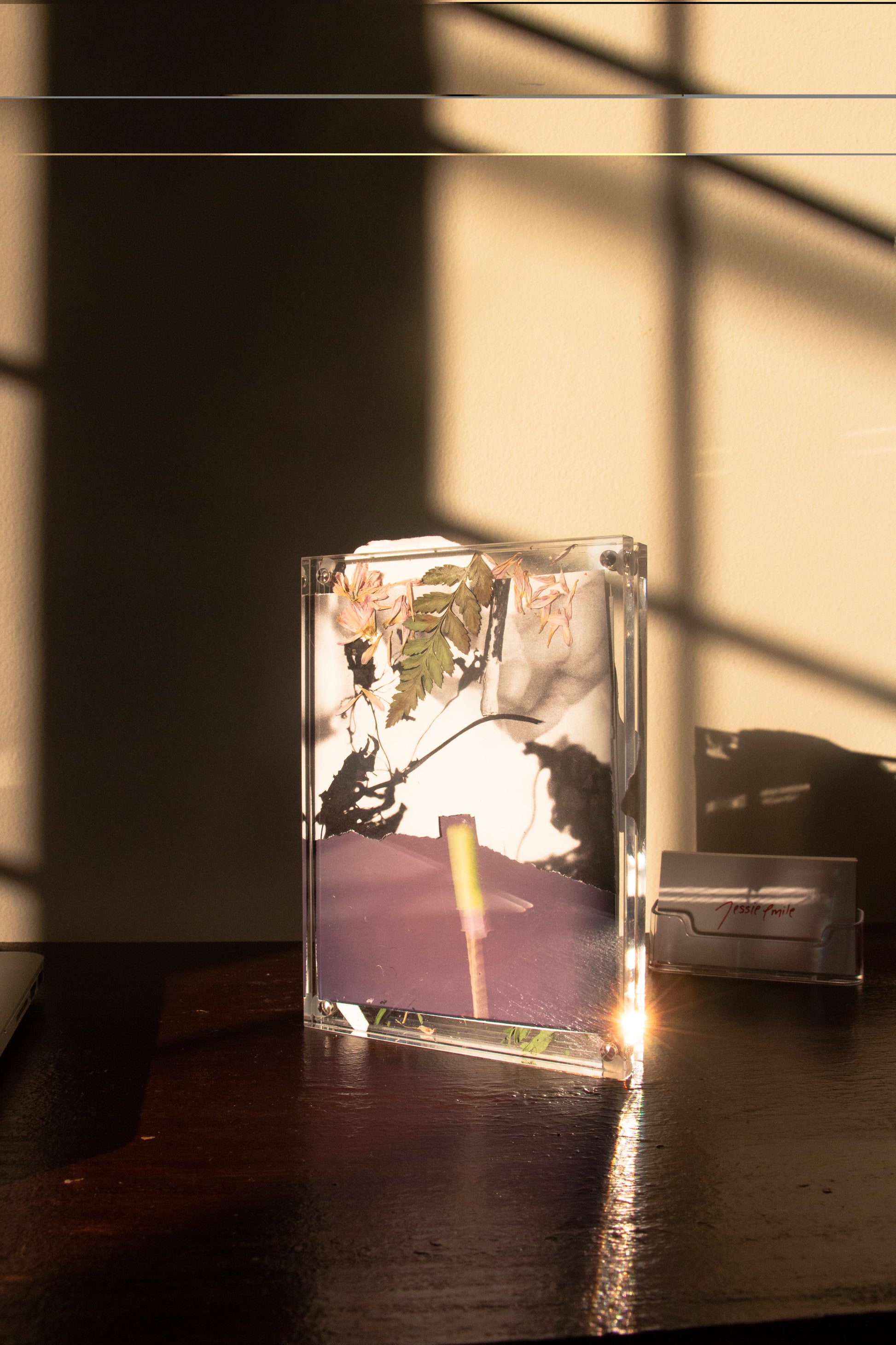 Every frames are uniquely made, an arrangement of real flowers onto a cotton paper, sealed into an acrylic frame.